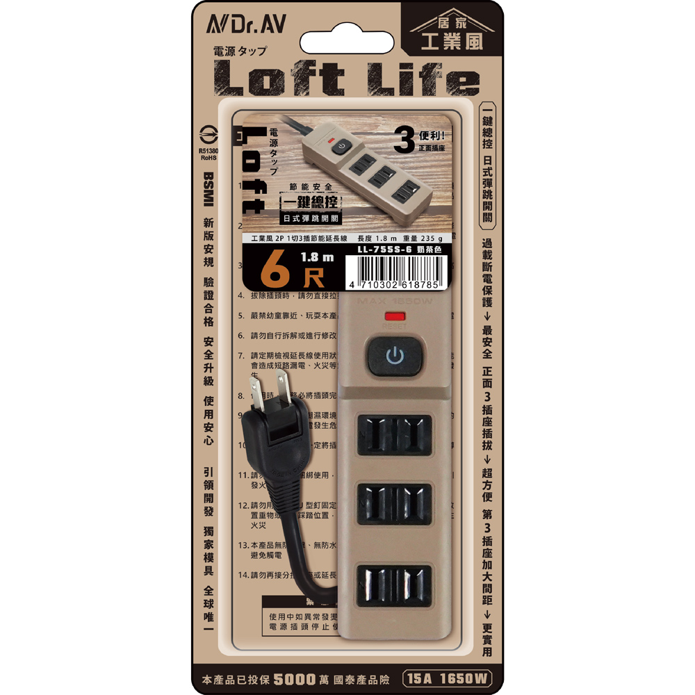 Dr.AV 聖岡 LL-755S-6 工業風2P1切3插節能延長線(6尺)
