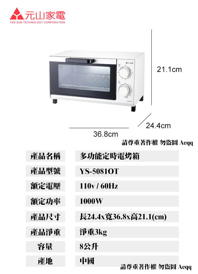 元山 YS-5081OT / 8L多功能定時電烤箱
