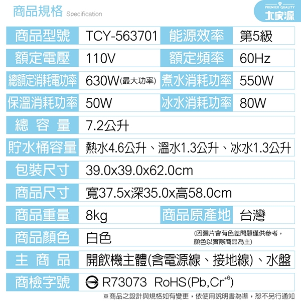 大家源 7.2公升冰溫熱開飲機/飲水機/淨水機 TCY-563701 |