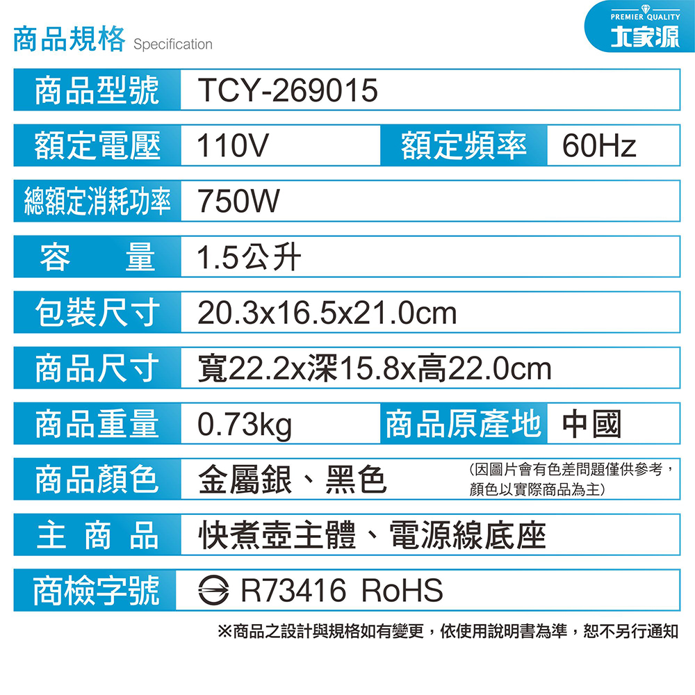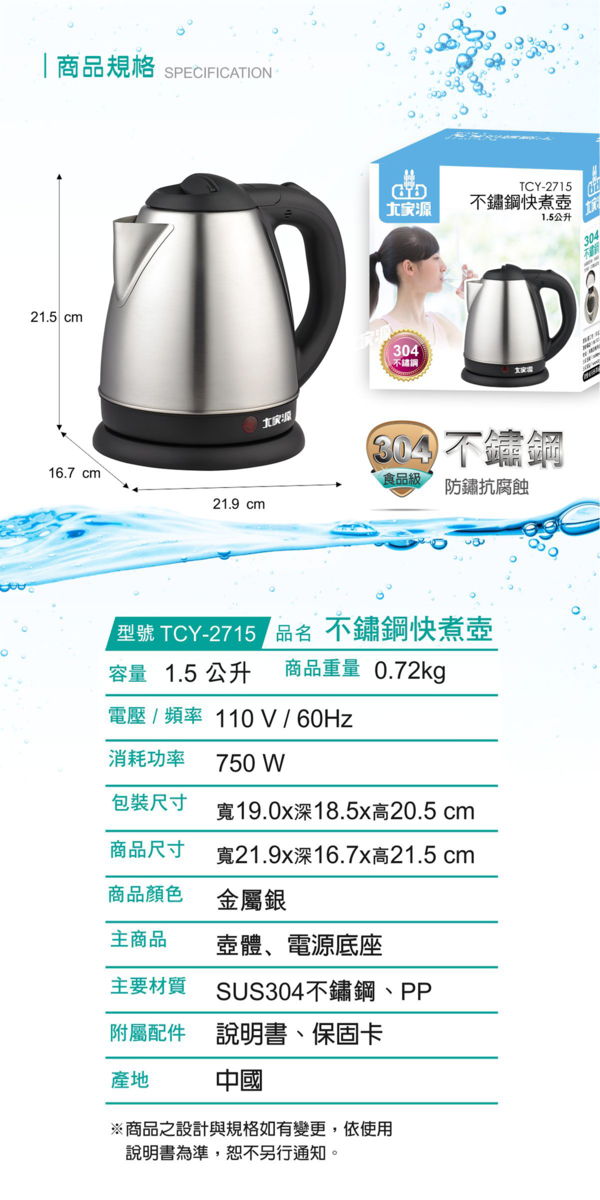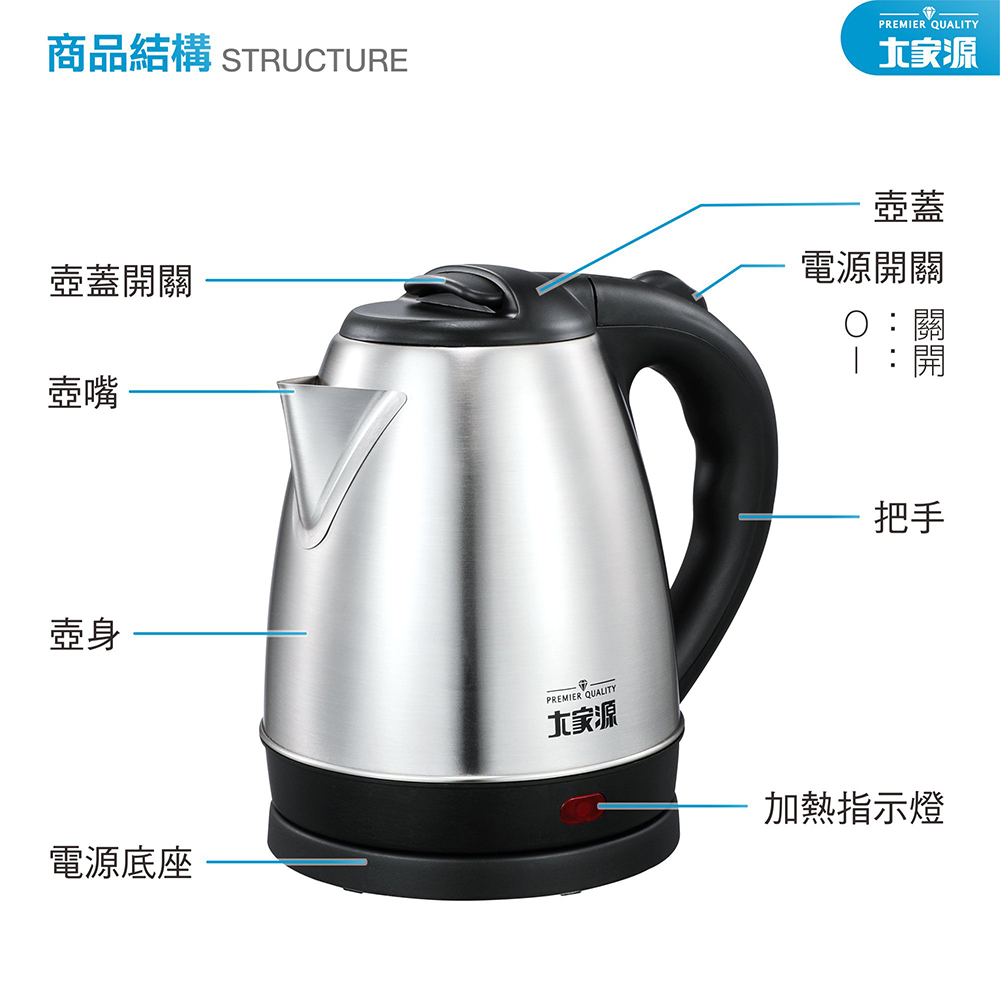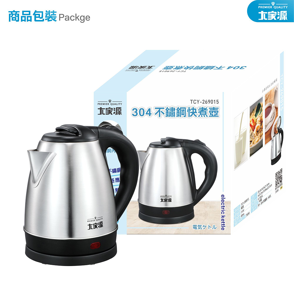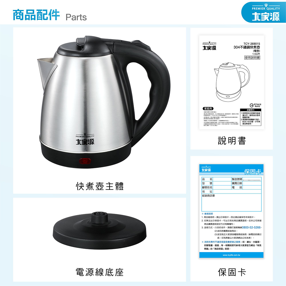 大家源 (1.5L) 304不鏽鋼分離式快煮壺/電水壺-按壓式上蓋