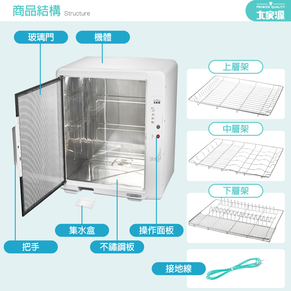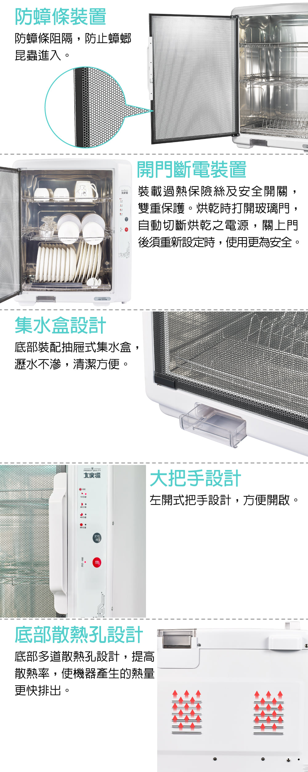 - 微電腦控制面板,烘乾、殺菌同時運作。