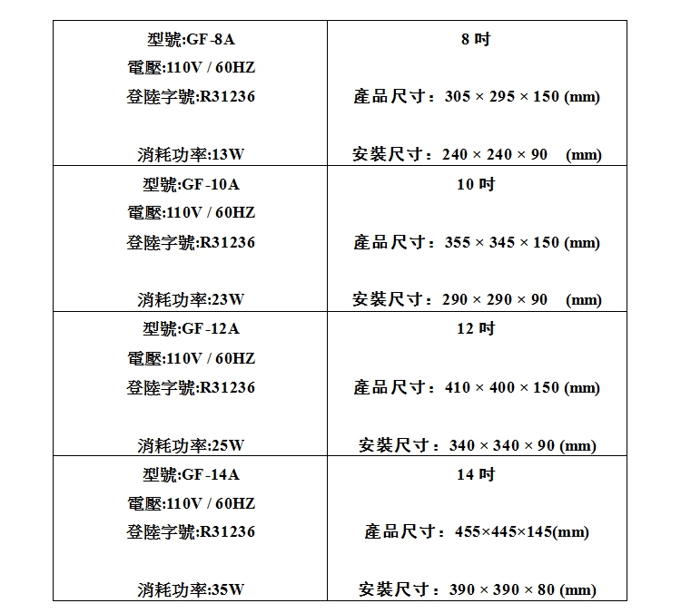 正豐GF-10A / 12A / 14A 百葉通風扇10/12/14吋