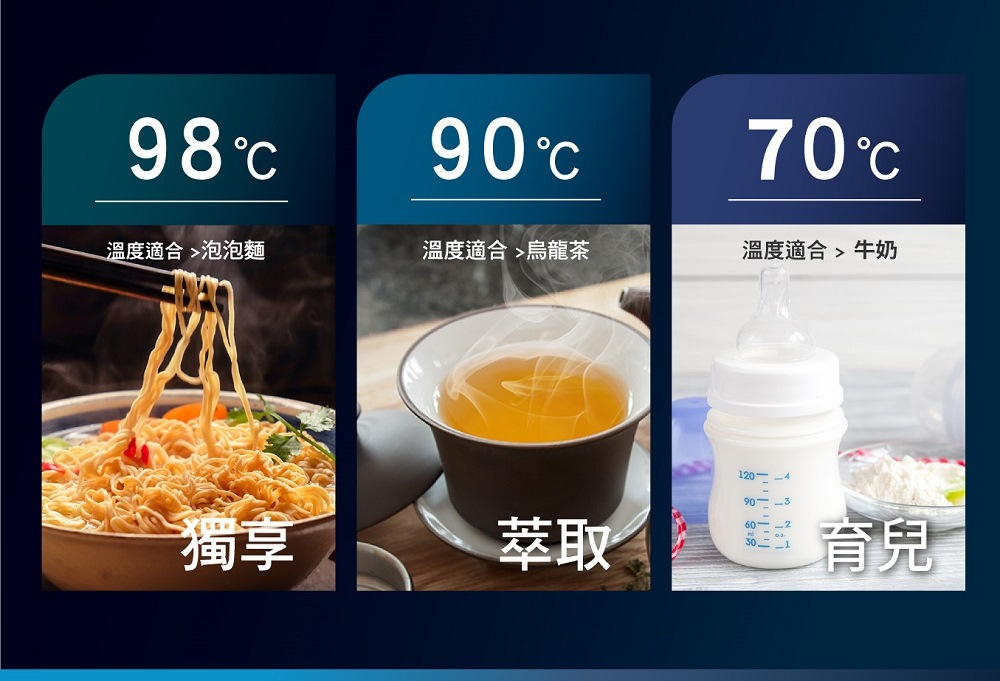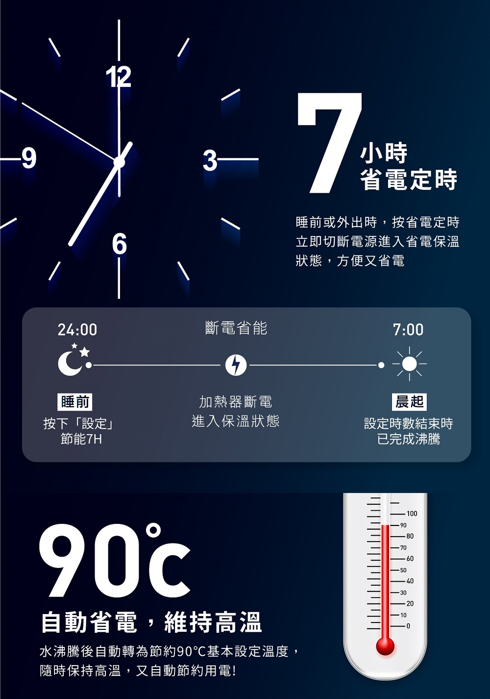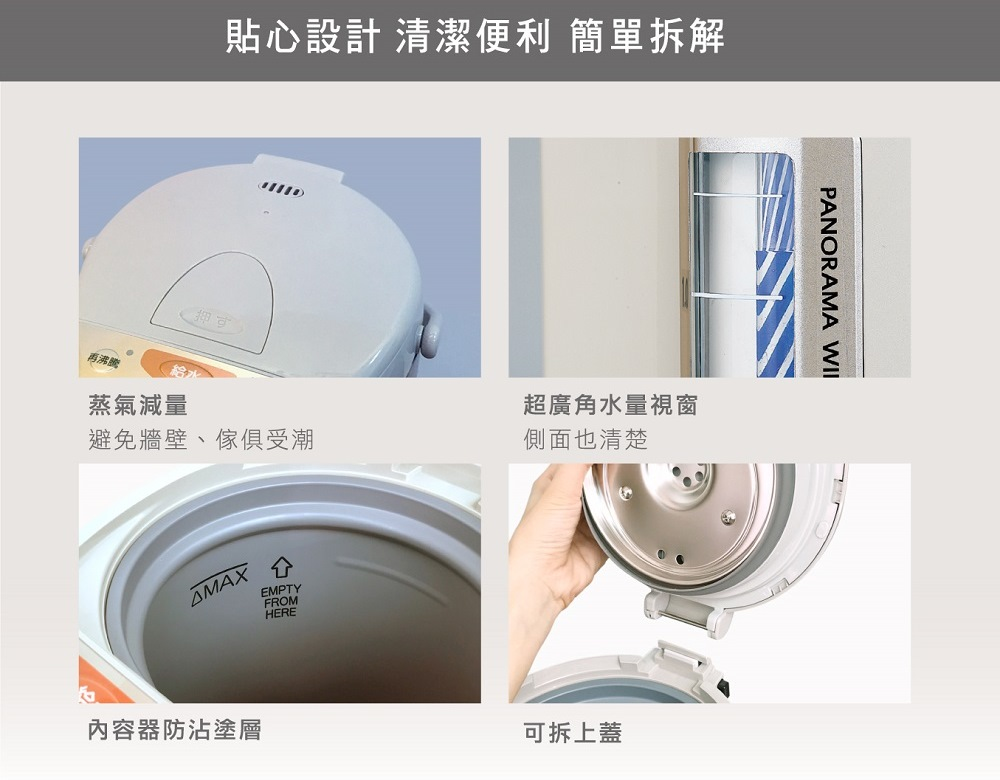 (7) 安全裝置:(a)防止空燒 (b)防止傾斜時熱水溢出 (c)上蓋2段式開啟設計 (d)電動給水鎖定裝置。