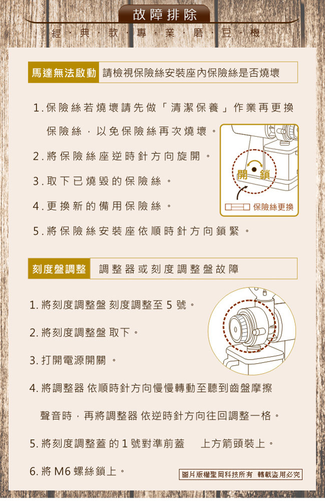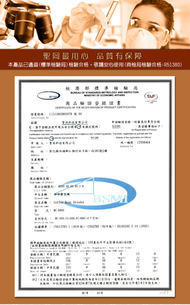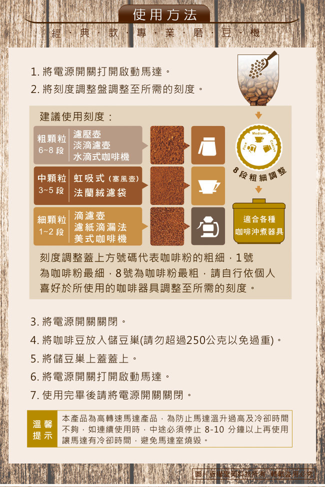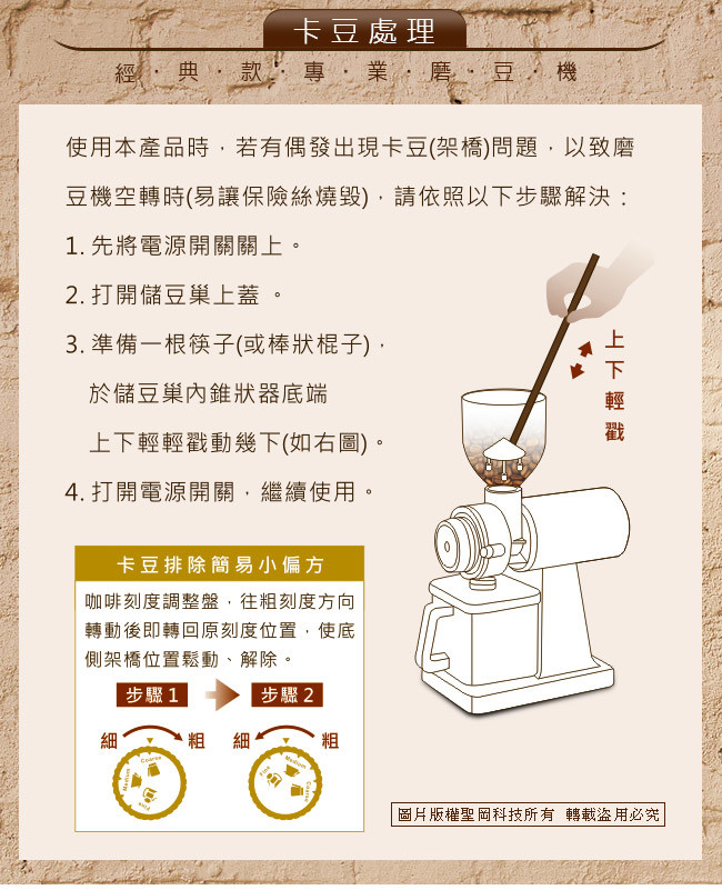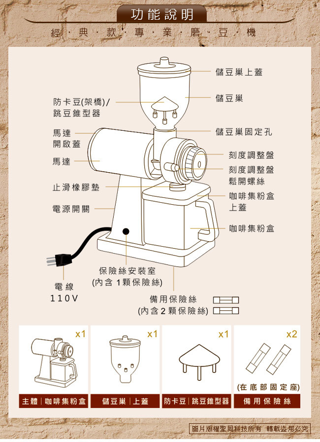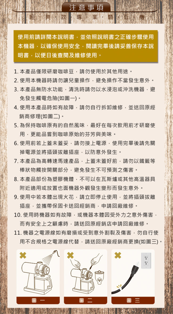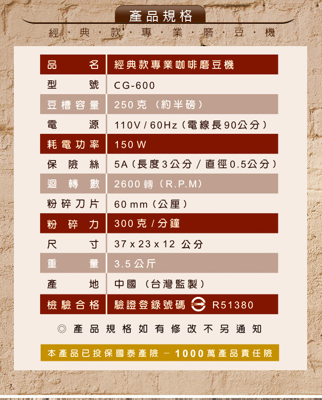 | 產品規格 品牌:Dr.AV 型號:BG-6000 豆槽容量:250G(克)約半磅 電源:110V/60Hz(電線長90公分) 耗電功率:150W 保險絲:5A(長度3公分/直徑0.5公分) 迴轉率:2600轉(R.P.M) 粉碎刀片:60mm(公厘) 粉碎粒:300G(克)/分鐘 尺寸:37x23x12cm(公分) 重量:3.5kg(公斤) 產地:中國(出廠前台灣檢測,品質保證) 檢驗合格:驗證登錄號碼:R51380 配件:內附保證卡 產品保固:1年 本產品已投保國泰產險-1000萬產品責任險 注意事項 ※ 本產品僅限研磨咖啡豆,請勿使用於其他用途。 ※ 使用本機器時請勿讓兒童操作,避免操作不當發生意外。 ※ 本產品無防水功能,清洗時請勿以水浸泡或沖洗機器,避免發生觸電危險。 ※ 使用本產品時如有故障,請勿自行拆卸維修,並送回原經銷商修理。 ※ 為保持咖啡原有的自然風味,最好在每次飲用前才研磨使用,更能品嘗到咖啡原始的芬芳與美味。 ※ 使用前若上蓋未蓋妥,請勿接上電源,使用完畢後請先關掉電源並將插頭拔離插座,以防意外發生。 ※ 本產品為高轉速馬達產品,上蓋未蓋好前,請勿以鐵籤等棒狀物觸按開關部分,避免發生不可預測之傷害。 ※ 本產品部份為塑膠機體,不可以在瓦斯爐或其他高溫器具附近使用或放置,導致機器外觀發生變形而發生意外。 ※ 使用中若本體出現火花,請立即停止使用,並將插頭拔 離插座,並攜帶保固卡送回經銷商,申請回廠維修。 ※ 使用時機器如有故障,或機器本體因受外力之意外傷害,而有安全上之顧慮時,請送回原經銷店申請回廠維修。 ※ 機器之電源線如有磨損或受到意外割裂及傷害,勿自行使用不合規格之電源線代替,請送回原廠經銷商更換。 ※ 保固期間如有下列情形要求服務者恕不免費優待 a.不可抗拒之天災地變所損壞者。 b.外力破壞、擅自拆裝等人為因素所致損壞者。 c.自行摔壞,被水侵襲損壞者。 ※ 本產品消耗品及包裝不在保固內,在保固期間內故障,本公司將酌收零件費及維修費(周邊零配件、刀盤、電源線、開關及、儲豆槽、咖啡集粉盒、防跳豆錐型器、保險絲..等,各項塑膠製品),本保固卡只限本體於正常使用狀況下有效。 ※ 機器空轉太久,會導致保險絲燒毀停止運轉。 ※ 使用前請先詳閱產品說明書,若未依正確操作使用而導致商品故障造成重大事故,恕不予保固並不負法律責任。 |