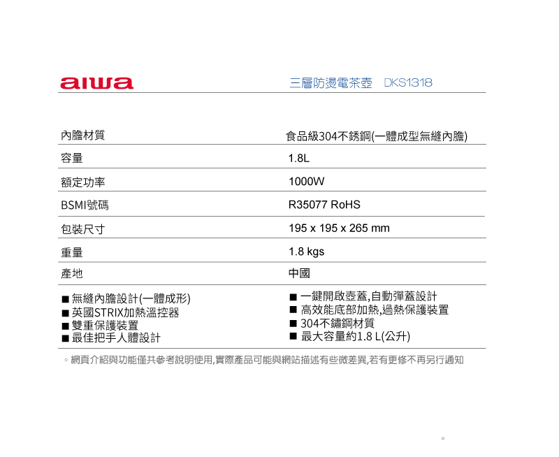 aiwa 愛華 DKS1318 (三層防燙電茶壼1.8L)