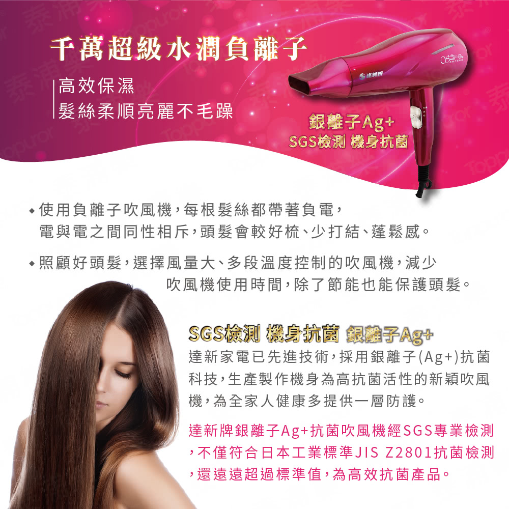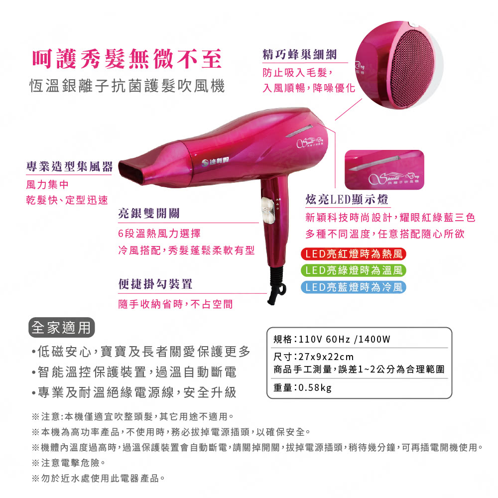 【達新牌】恆溫銀離子抗菌護髮吹風機TS2968(CB710001) 品牌名稱 達新牌 類型 有線 110V 適用於 所有髮質 功能 負離子 效能 1401W~1500W 保固期 1年保固期 商品規格 電壓:110V 60HZ 消耗功率:1400W