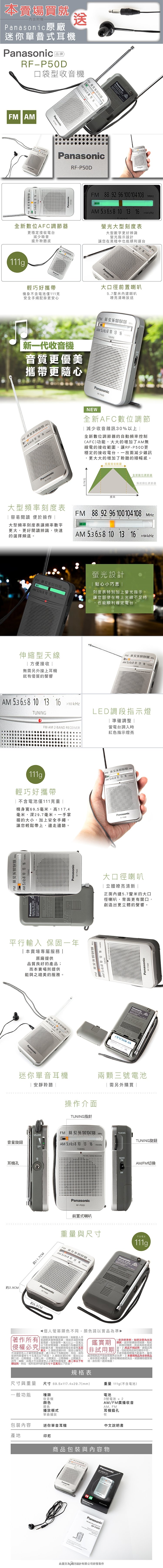 | Panasonic RF-P50二波段收音機可接收AM/FM二波段廣播。外型採用簡單時尚銀設計,機體大小適合放入口袋,除了攜帶方便外,可伸縮天線置於機體後方,不用接耳機就可清楚接收到,接收性能佳。Panasonic RF-P50內置 5.7cm 前置式揚聲器,輸出音質清晰優美,機體上有 TUNE調諧指示燈、TUNING調諧度旋轉鈕、音量調節鈕、AM/FM切換鈕及耳機插孔,讓您使用更方便。外形輕巧、攜帶方便的RF-P50,非常適合居家休閒、戶外活動時隨身聆聽電視或電台節目使用。內附手提繩及單耳耳機各一只。 | ||||||||||||||