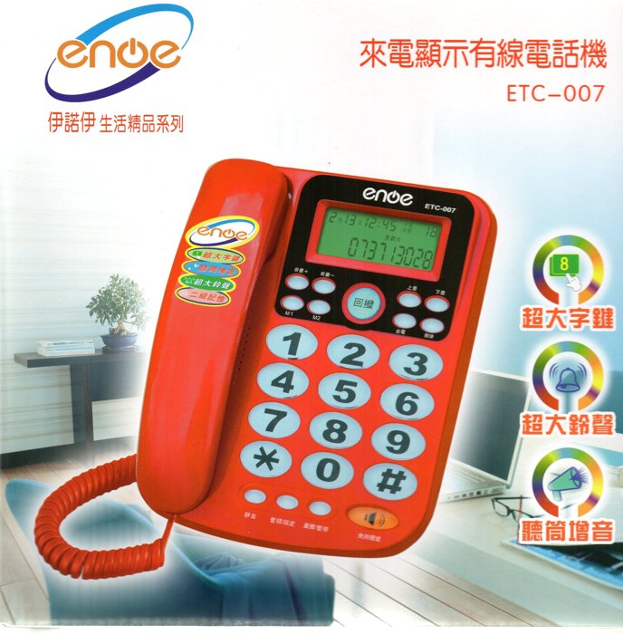 enoe 伊諾伊 ETC-007來電顯示有線電話機_超大字鍵/聽筒增音/超大鈴聲/二組記憶_紅色/藍色