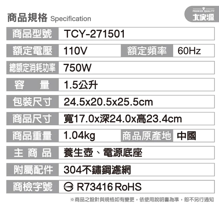 主 商 品:養生壺、電源底座 附屬配件:304不鏽鋼濾網